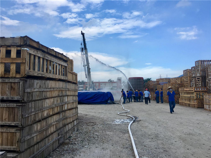 模擬火災(zāi)現(xiàn)場消防演習(xí)設(shè)定30畝產(chǎn)品堆放區(qū)為著火點(diǎn),分為四個組配合完成任務(wù)。第一組(滅火組)快速趕到事發(fā)地切斷電源,組員接好水帶水槍,用滅火器滅火;第二組(人員疏散組)組織疏散現(xiàn)場周圍人員,沿出口指示方向撤至一樓安全地方,保證樓道暢通,防止踩踏事故;第三組(人員物資搶救組)配合滅火組清理現(xiàn)場周圍物品,開辟防火隔離帶,救護(hù)傷員,用人工呼吸作簡單救治;第四組(照明、通訊組)配合其他三組負(fù)責(zé)場地照明、報(bào)警、模擬說明地址接警車、保證車道暢通到事發(fā)現(xiàn)場,滅火后留現(xiàn)場值班,防止二次火災(zāi)發(fā)生。