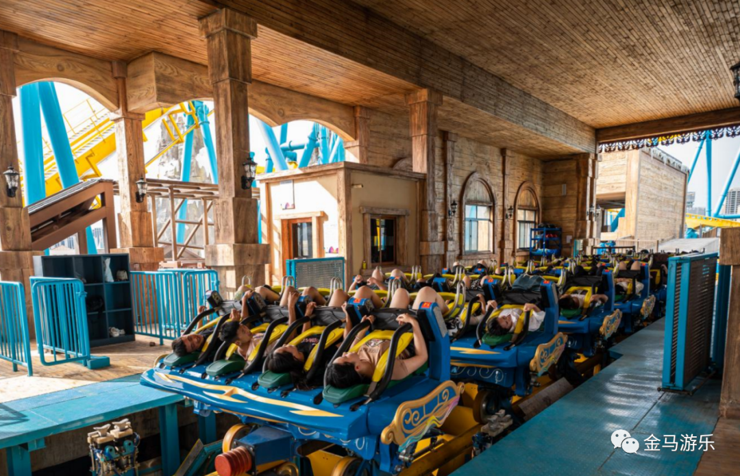與其他飛行過山車不同,金馬飛行過山車在站臺區(qū)車體位于軌道上方,配合水平面上下客平臺,改善了乘客臥姿上下的不適與不便,有效提升舒適度與運營效率,理論客流量達(dá)1440PPH。