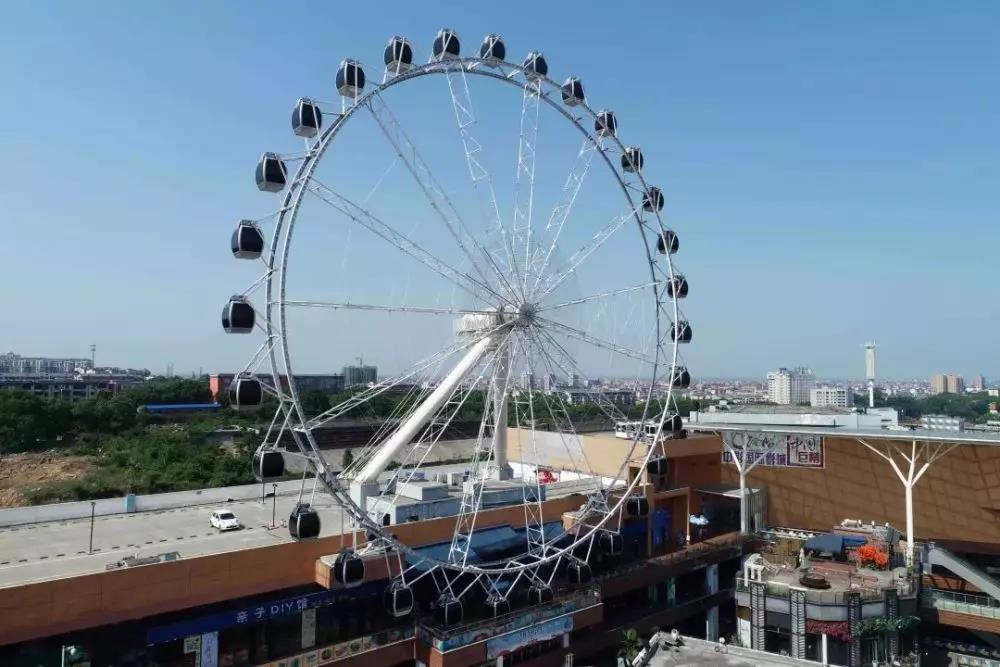 GLC-52A觀覽車是中山金馬自主研發(fā)的觀覽車類游藝機。整個產(chǎn)品由塔架、主軸、轉盤、吊廂、驅動系統(tǒng)組成。塔架由2根立柱構成,分布在轉盤一側,整個轉盤呈懸臂梁結構,在塔架支撐的基礎上增加鋼索固定。主軸水平布置,主軸上的轉筒隨著設備運行而轉動。轉盤采用桁架式結構,轉盤上均勻地分布著30個吊廂,每個吊廂最大乘客量6人。游客乘座吊廂沿轉盤運行,體驗著觀光賞景的樂趣;新穎獨特的懸臂結構,再配以明麗變幻、動感迷人的燈飾,別具匠心的現(xiàn)場配景,以及柔美動聽的背景音樂,使得本設備深受游客的歡迎,也是一個重要的城市地標。