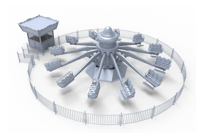 彈跳機(jī)中軸為中心帶動周圍十二個座艙繞豎直中軸旋轉(zhuǎn),同時座艙伴隨著音樂進(jìn)行高低、快慢不同的跳躍式運(yùn)動。使乘客在游玩過程中體驗到旋轉(zhuǎn)加跳躍的樂趣。