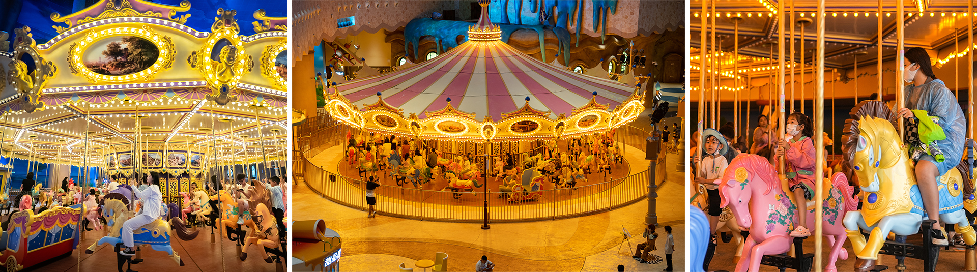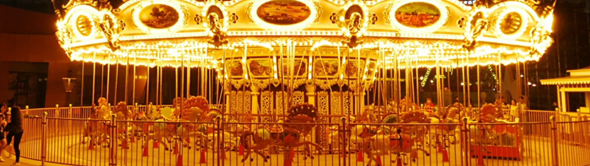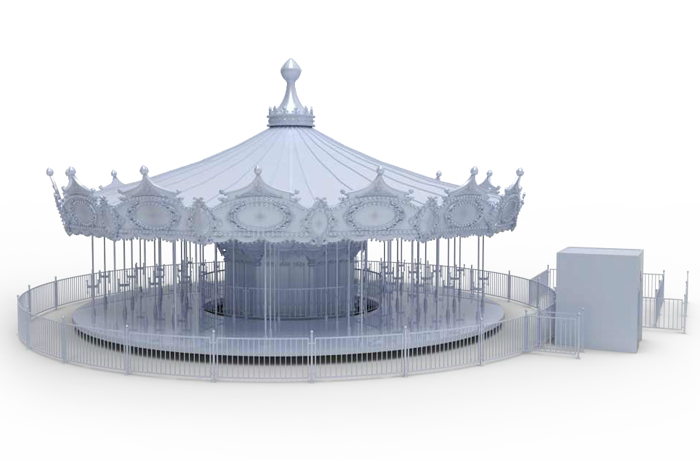 豪華轉(zhuǎn)馬采用歐洲皇家的古典豪華的裝飾風(fēng)格,頂棚華麗,內(nèi)外圍板鑲嵌著彩色浮雕和絢爛彩燈,馬匹及宮庭式馬車結(jié)合多彩的花飾,造型精致夢幻。