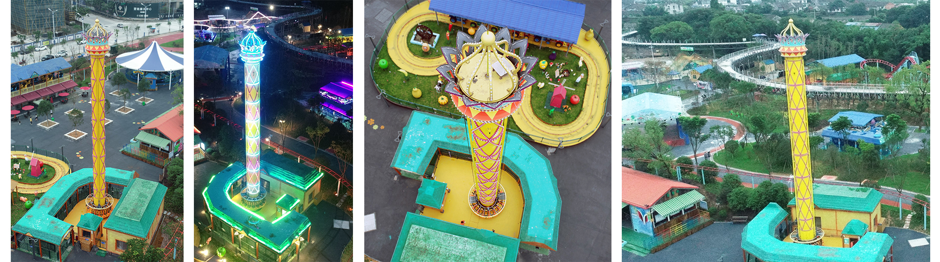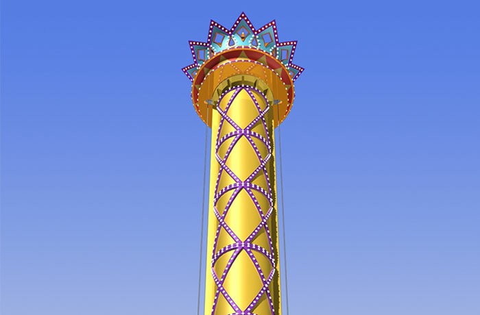旋轉(zhuǎn)太空梭集傳統(tǒng)跳樓機(jī)豎直升降運(yùn)動(dòng)和旋轉(zhuǎn)運(yùn)動(dòng)于一身,運(yùn)動(dòng)方式多樣新穎,其簡(jiǎn)形塔架可繞其自身下端轉(zhuǎn)動(dòng),滑行架跟隨塔架旋轉(zhuǎn)的同時(shí)支撐座椅沿塔架豎直軌道做升降運(yùn)動(dòng)。