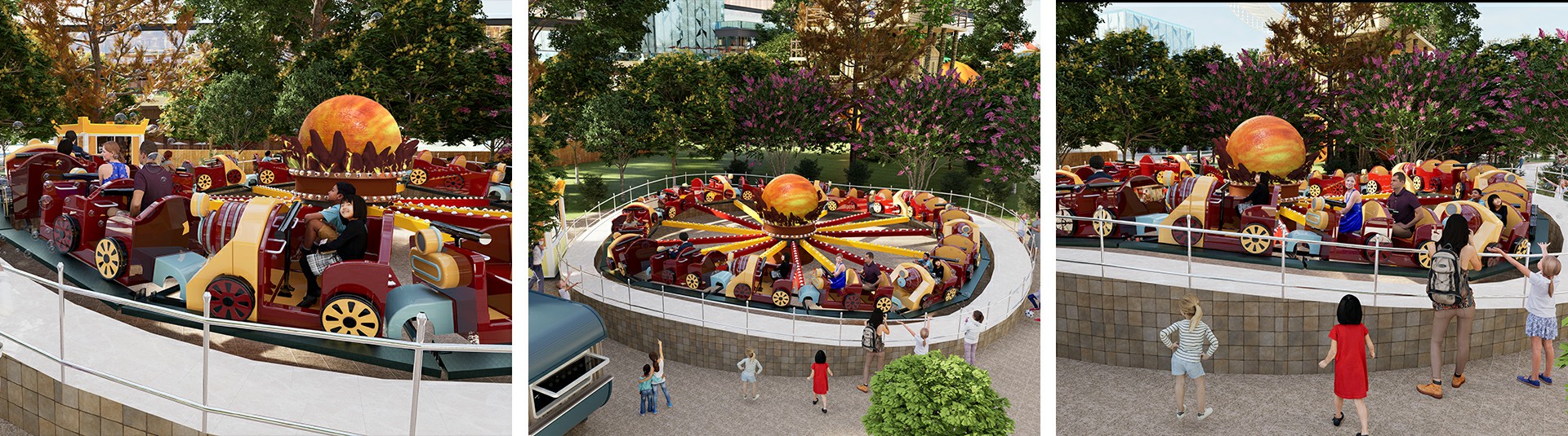 YKC-48B型烈焰戰(zhàn)車(chē),以戰(zhàn)車(chē)追逐恒星為主題,中間支撐座裝有回轉(zhuǎn)支承連接16條轉(zhuǎn)臂。每條轉(zhuǎn)臂自帶行走輪,其中四條轉(zhuǎn)臂帶有驅(qū)動(dòng)裝置,而16個(gè)座艙分別安裝在轉(zhuǎn)臂之間。轉(zhuǎn)臂行走輪下方布置有環(huán)形的起伏路軌,在轉(zhuǎn)臂驅(qū)動(dòng) 裝置的驅(qū)動(dòng)下,烈焰車(chē)體圍繞中心的恒星高低起伏轉(zhuǎn)動(dòng),座艙隨轉(zhuǎn)臂旋轉(zhuǎn)運(yùn)動(dòng) 的同時(shí),并沿路軌上下運(yùn)動(dòng),使乘客體驗(yàn)多重復(fù)合旋轉(zhuǎn)運(yùn)動(dòng)帶來(lái)的樂(lè)趣。