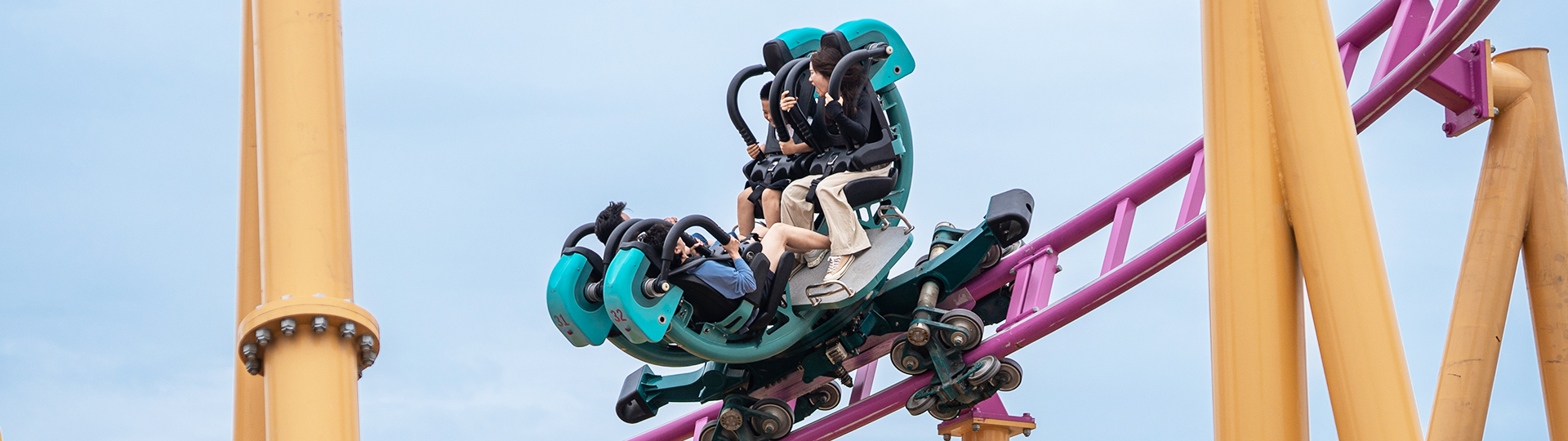 超炫過山車將720°螺旋下降、水平螺旋環(huán)等元素與自轉(zhuǎn)回旋車體結(jié)合,同時(shí)創(chuàng)新地將過山車有傾?的路軌引入到自旋滑車的軌道中,打造出兼具失重、超重和回旋的多重游玩體驗(yàn)。四人車體中游客兩兩對(duì)坐,促進(jìn)互動(dòng)交流。奧德賽歷險(xiǎn)創(chuàng)意主題造型吸引著眾多情侶、親子游客前來挑戰(zhàn)。
