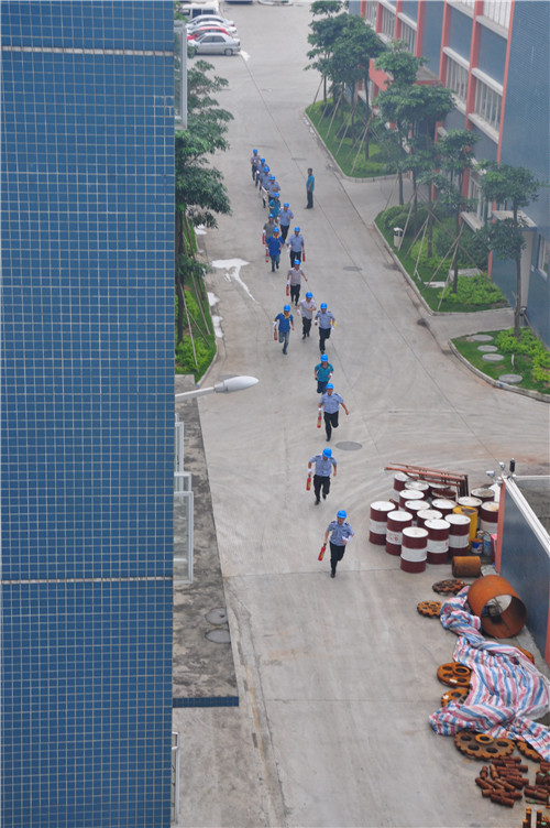 本次演練以消防重點(diǎn)車間的頂層出現(xiàn)火災(zāi)警情為模擬場景,于計(jì)劃當(dāng)日下午15:45進(jìn)行。在正式開始前,金馬義務(wù)消防隊(duì)在公司大門集結(jié),配備相關(guān)設(shè)備整齊列隊(duì),等待總指揮下達(dá)啟動(dòng)命令。時(shí)間一到,由生產(chǎn)中心高總、人力資源中心容部長示意行動(dòng)開始,保安隊(duì)長接受命令,并向待命的消防隊(duì)傳達(dá)立即到處滅火的指示。接到消息,金馬義務(wù)保安隊(duì)火速奔赴火警現(xiàn)場——距離出發(fā)點(diǎn)300多米的車間4樓頂層。僅用時(shí)2:37,撲火組已到達(dá)現(xiàn)場,根據(jù)燃燒物特性,用滅火器迅速進(jìn)行第一輪滅火。待火勢稍減,他們快速移開燃燒物,阻擾火勢蔓延,并打開消防喉進(jìn)行撲救。與此同時(shí),救護(hù)組也已到達(dá)現(xiàn)場,展開擔(dān)架轉(zhuǎn)移傷員,到達(dá)安全場所進(jìn)行搶進(jìn)。不久,火勢撲滅,在各消防小組的密切配合下,本次消防演練勝利結(jié)束。