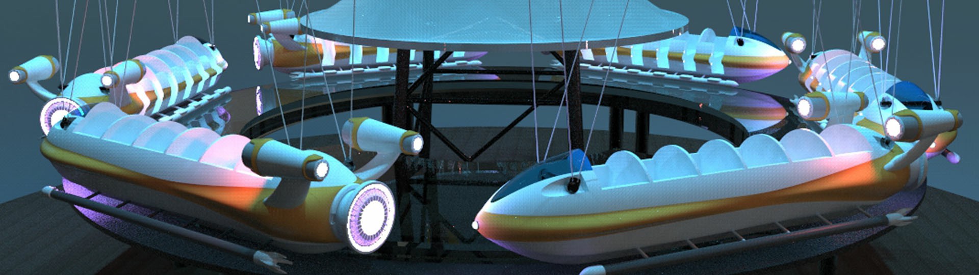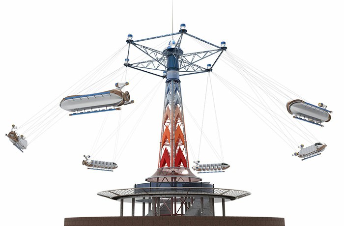幻速追影六個飛機吊掛座艙隨同旋轉(zhuǎn)架相對塔體自由旋轉(zhuǎn)并外擺升起,繞中心立柱飛行,科幻又刺激。夜間智能燈光系統(tǒng)亮起,成為樂園一道的奇趣風(fēng)景線。