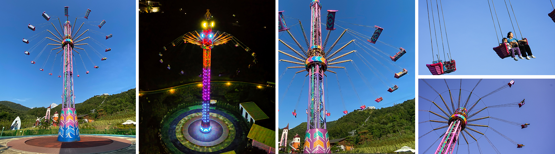 飛行塔設備由塔體、滑?架、吊椅三部分組成。獨有雙人座椅設計,隨著速率越來越快,座椅在半空中向外飄散,在整個游玩過程中乘客可充分享受高速飛行的暢快,刺激又浪漫。