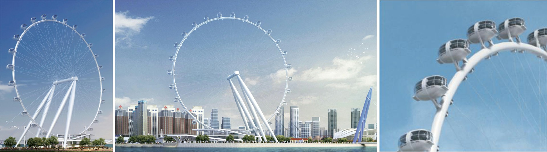 128米觀覽車是全球首創(chuàng)懸臂斜拉式立柱結(jié)構(gòu),造型宏偉壯觀;融合 LED大屏與炫彩燈效,專為地標項目打造。觀景艙為子主研發(fā)的全球最大的單環(huán)平衡滾艙,艙內(nèi)可進行主題餐廳、個性婚慶等娛樂場景搭建;720度全景座艙,為乘客提供全體無遮擋觀覽體驗。
